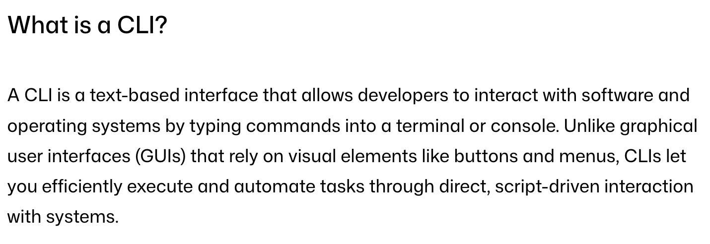 A CLI (command-line interface), as GitHub’s official resources define above, is an interface that allows you (or these days AI as well) to interact with an app from typing into your console.