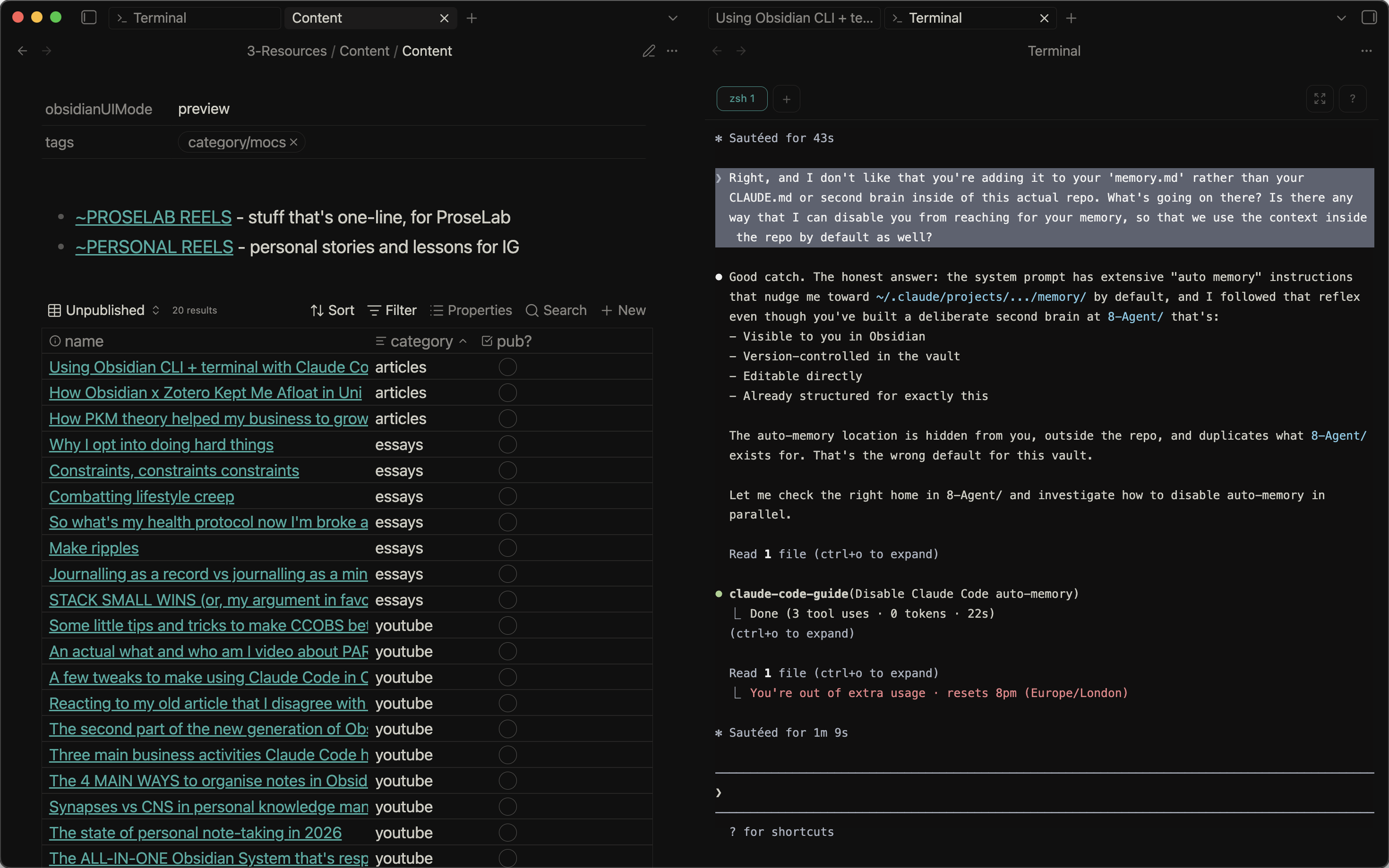 I run it split with my note of focus in my Obsidian, and it inherits the fonts from the theme, looking for all the world like it’s an integrated part of the app. I start working without having to context switch from the terminal, to Obsidian and back again…
