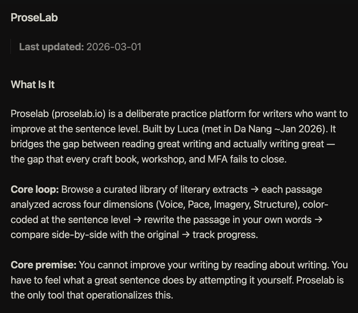 ProseLab’s a writing tool. My cofounder Luca loves crafting short stories and other prose, but he’s at a plateau within the perceived quality of the work that he’s creating.
