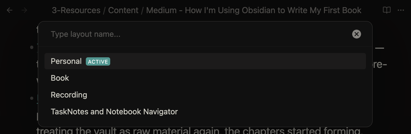Because I use a different workspace layout for general Obsidian use and book-writing (the latter having the Longform sidebar open as shown in that plugin’s section), using Workspaces saves me set-up time, and makes sure that I enter book-writing context a lot more comfortably when I change over to outlining and drafting.