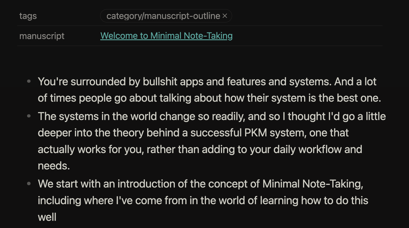 This could explicitly be an idea that can be used in the book, or just something I’ve experienced or noticed, that I can then process into the Zettelkasten of my vault, and then incorporate into the manuscript a little later.