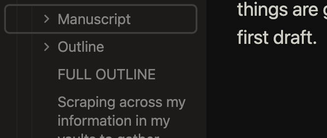 First, I use a recursive outline - the main book outline sits in the highest level file, and inside of this file I have wikilinks that send the click to a more in-depth version of the file, where I actually link to the page in the ‘Script’ subfolder where I’m drafting.